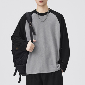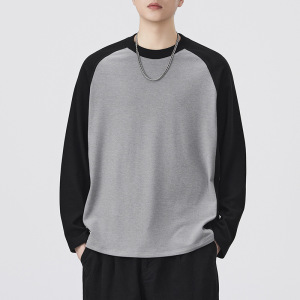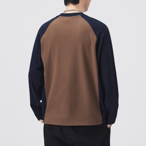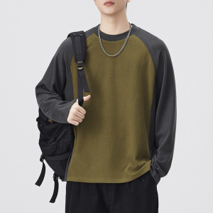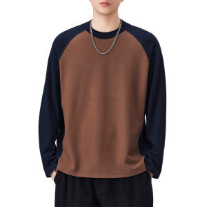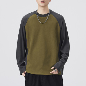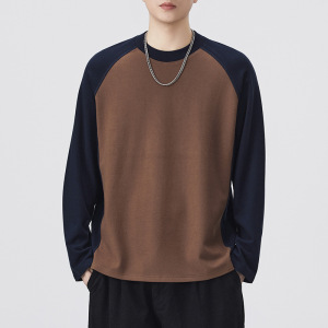 安洋美式撞色圆领t插肩长袖T恤男2025秋季新款拼接打底衫宽松上衣