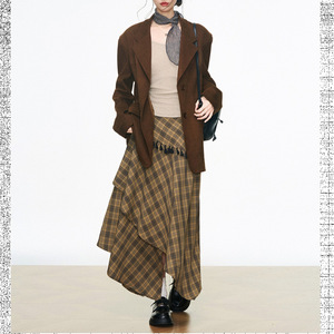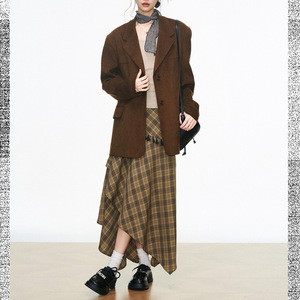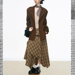 设计感鹿皮绒西装外套内搭T恤+流苏格纹半身裙三件套装女秋季新款