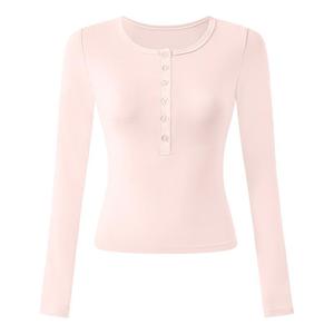 粉色半开v领纽扣长袖t恤女秋季纯欲风收腰打底衫正肩修身短款上衣
