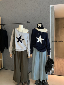 WGWE秋冬新款韩系时髦五角星图案宽松显瘦一字肩长袖针织衫W7263