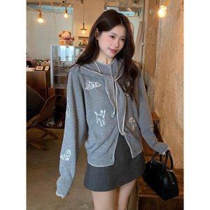 学院风针织开衫女韩系早秋穿搭小狗刺绣毛衣外套修身显瘦领带上衣