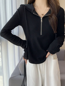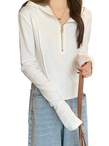白色连帽长袖t恤女秋季小众独特别致设计感短款上衣内搭打底衫