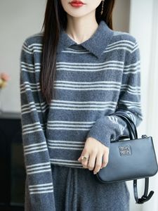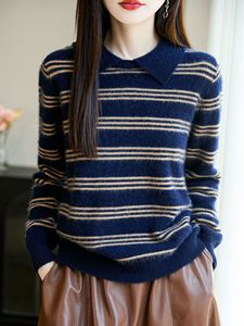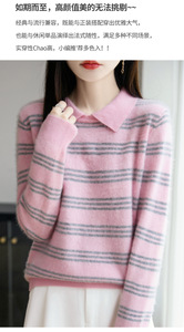 秋冬款100%纯羊毛衫女POLO领条纹拼色针织毛衣学院风宽松打底上衣