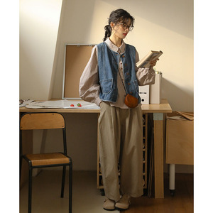 实拍2025秋季新款 复古文艺叠穿日系简约口袋休闲牛仔马甲女88471