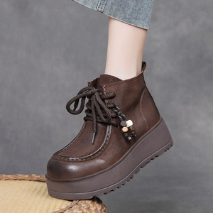 吉树25秋冬头层牛皮厚底短靴真皮复古串珠手工单靴小个子坡跟女靴