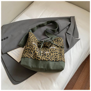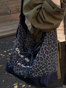 复古豹纹拼接双面包大容量牛仔托特包美式斜挎包慵懒风休闲单肩包