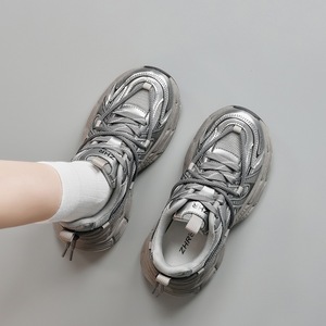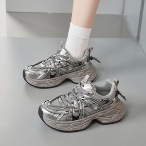 ZHR【增高5cm】银色厚底老爹鞋女2025秋季网面透气轻便运动休闲鞋
