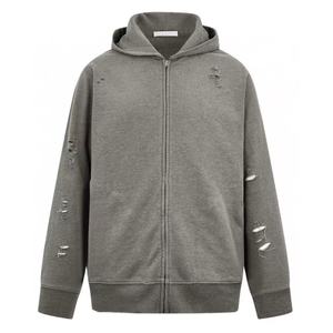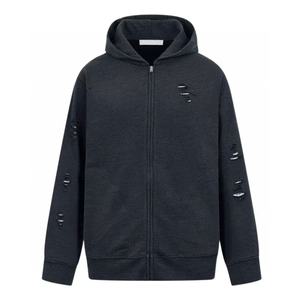 2025as新款破洞做旧磨损毛圈布印花拉链连帽卫衣外套男女款高版版