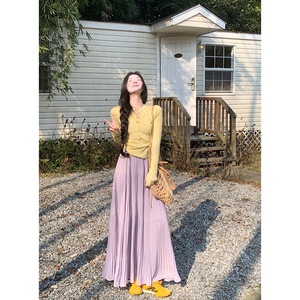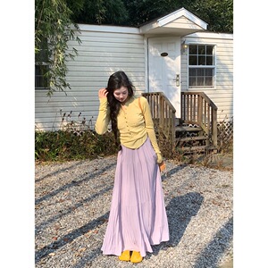 实拍 黄色多扣针织高弹上衣+压褶半身裙宽松大裙摆a字长裙套装女