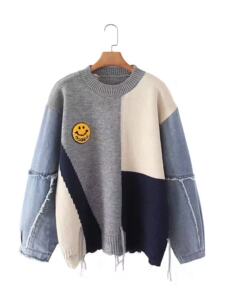 欧美风跨境秋冬牛仔袖拼接撞色笑脸宽松套头毛衣圆领针织打底衫女