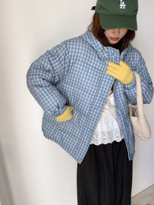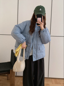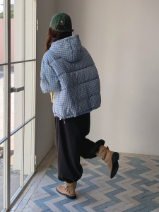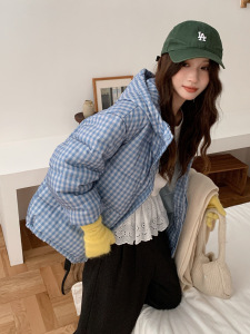 韩版蓝色格子冬季棉衣外套2025面包服新款短款宽松连帽加厚棉服潮