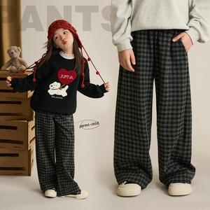 新款秋冬暖云绒甜美儿童方格卫裤男女童宽松百搭直筒休闲裤