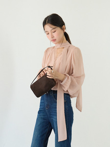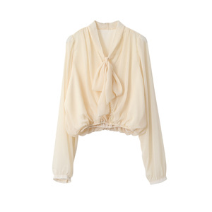 【欧凡】挂脖系带气质蕾丝v领长袖衬衣秋甜美花苞短款衬衫女3203