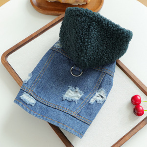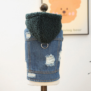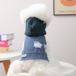 宠物衣服秋冬新款小型犬幼犬快乐狗猫保暖舒适羔羔绒帽牛仔衣绿帽