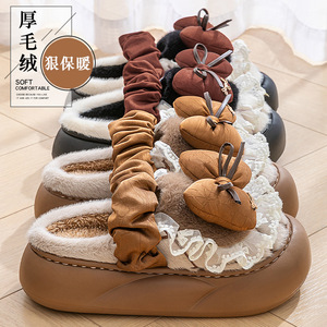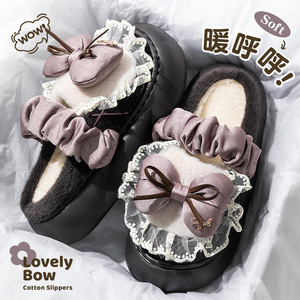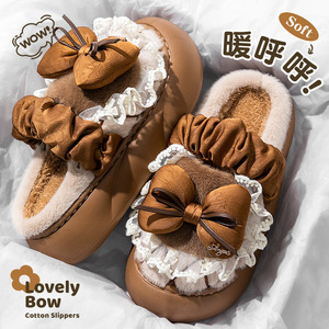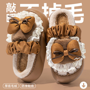 蝴蝶结棉拖鞋女款2025新款秋冬季室内家居防滑静音毛毛绒月子鞋女