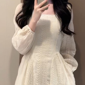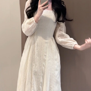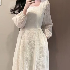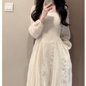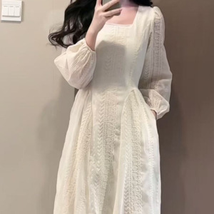 法式温柔杏雨梨云方领裙子女早秋2025新款韩系千金感收腰气质长裙
