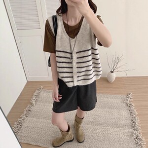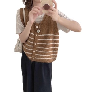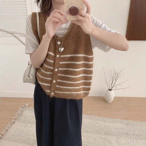 秋冬新款宽松百搭无袖坎肩背心上衣外套潮韩系复古条纹针织马甲女