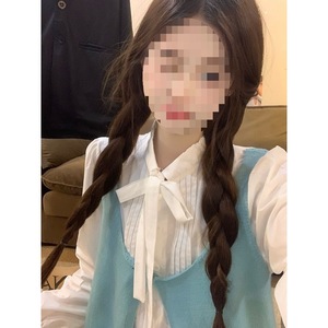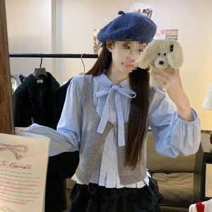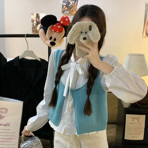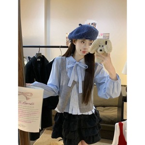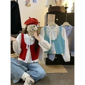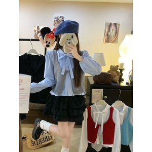 秋冬款公主韩版系带长袖衬衫叠穿简约针织马甲背心日系甜美两件套