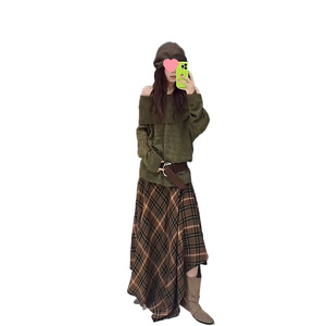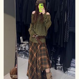 轻熟风时尚绿色一字肩长袖针织上衣女秋季格纹不规则半身裙两件套