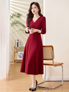 红色气质V领连衣裙女秋2025新款收腰显瘦高端时尚长袖裙子 Z5657
