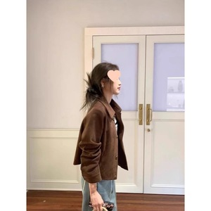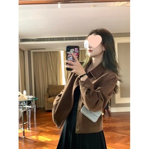 复古韩系咖色外套女短小个子款春秋夹克上衣宽松款鹿皮绒休闲