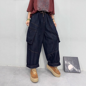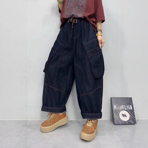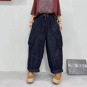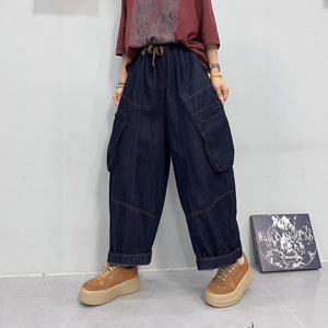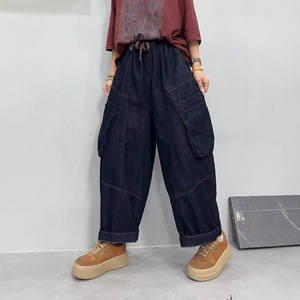大码牛仔裤2025秋款新品大口袋松紧腰简约时尚潮个性大版哈伦裤子