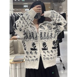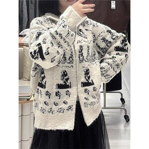 现货2025早秋新款苗纹羊羔绒针织开衫女宽松显瘦长袖毛衣外套上衣