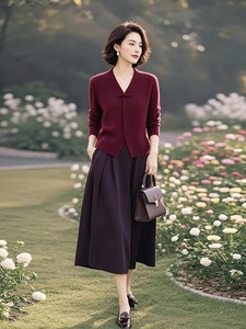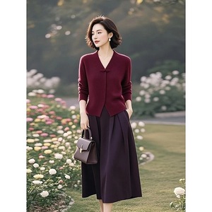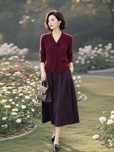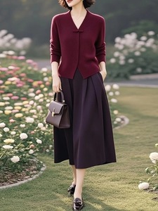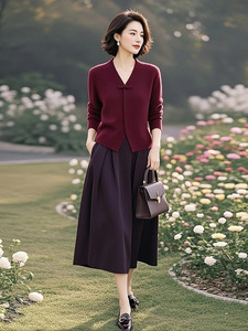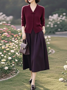 漂亮女装高端时尚搭配一整套高级感冬装气质酒红色针织毛衣裙子套
