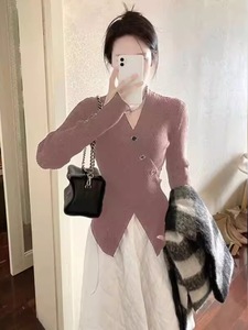 秋季v领长袖打底针织衫上衣洋气别致独特设计感小众毛衣女款内搭