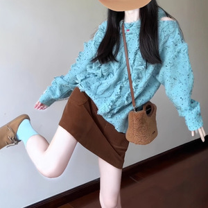 秋冬穿搭一整套新款多巴胺巨好看流苏漏肩毛衣针织衫半身裙套装女