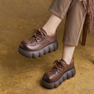 2025秋季圆头英伦风牛皮厚底系带单鞋女休闲坡跟轻便坡跟小皮鞋