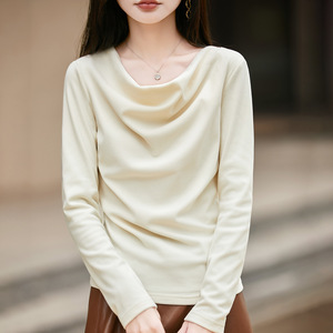 25年早秋新款双面绒荡领针织衫长袖女纯色褶皱宽松套头打底衫上衣