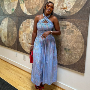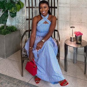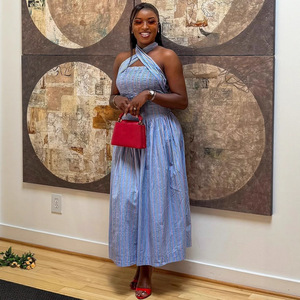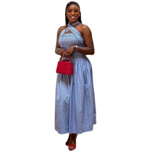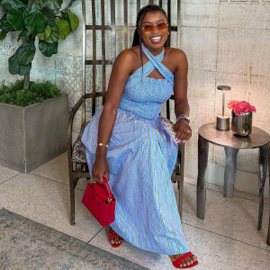 欧美女装蓝色条纹交叉抹胸露肩连衣裙女非洲收腰显瘦新款百搭长裙