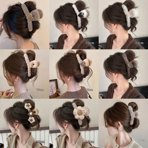 卡通百搭大号盘发鲨鱼夹女高级感毛茸茸发夹韩系小熊毛绒抓夹头饰