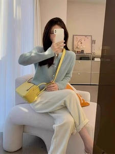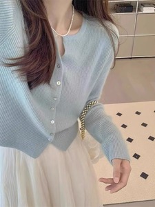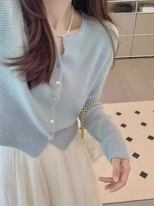 法式感蓝色针织开衫女2025早秋新款温柔薄款毛衣外套气质上衣百搭