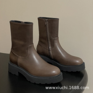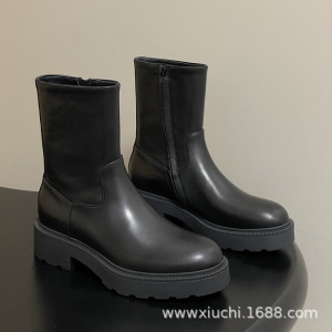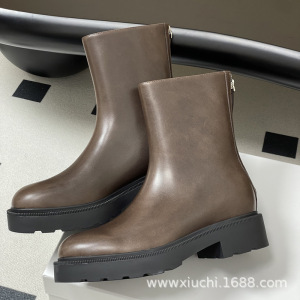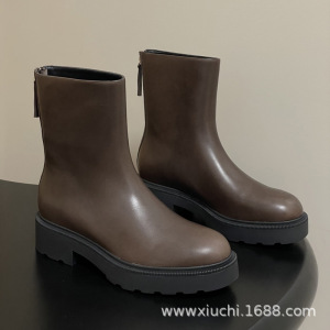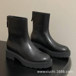 高版2025TR法式复古切尔西短靴极简厚底后拉链及踝靴真皮烟管靴