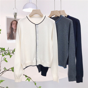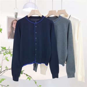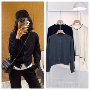 8217电光蓝撞色门襟秋冬季羊毛混纺圆领排扣收腰显瘦针织衫开衫女