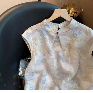 2025复古新款绝美上衣夏季中式国风高级盘扣提花无袖缎面衬衫