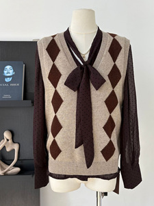 Helloo Eat 秋季复古v领菱格马甲杏色百搭套头羊毛叠穿无袖上衣女