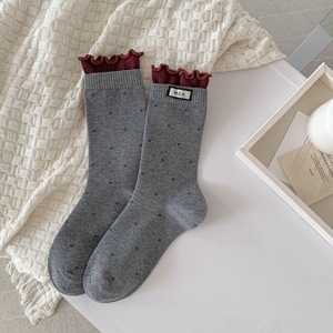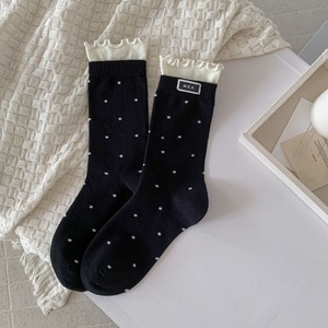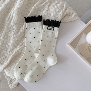 早秋木耳边袜子女中筒袜芭蕾风英文布标设计感简约休闲波点堆堆袜