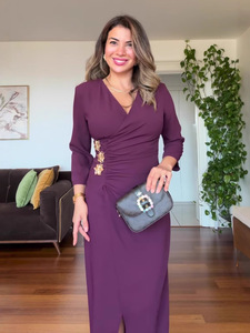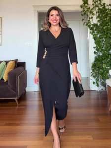 2025秋季新款欧美亚马逊跨境外贸女装纯色长袖V领高腰开叉长裙子