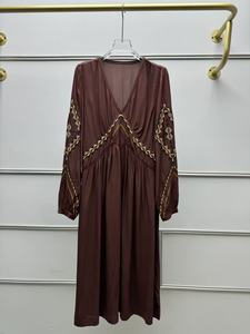 南油连衣裙高级感法式度假棕色V领刺绣长袖连衣裙收腰显瘦中长裙