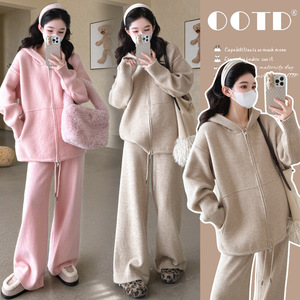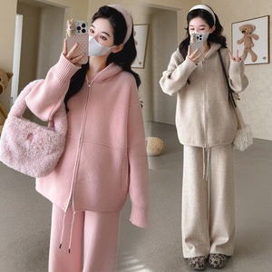 孕妇秋冬抽绳拉链时尚连帽开衫毛衣休闲款时尚阔腿裤宽松甜美套装