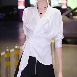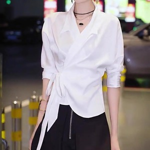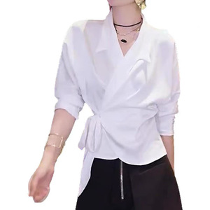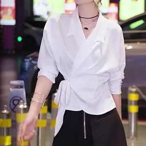 现货厂家批发 时髦洋气白色翻领收腰系带气质高JI感长袖衬衫女