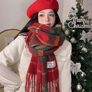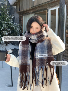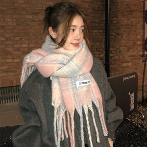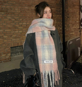 韩系马海毛氛围感粉色格纹围巾女冬季保暖百搭流苏长款围脖批发