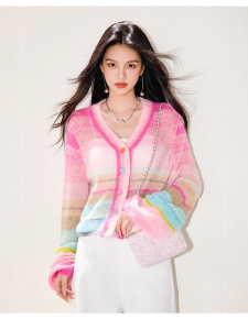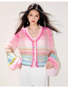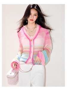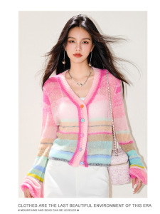 LUMANMAN多巴胺毛衣针织开衫V领彩扣条纹氛围感微透明罩衫上衣