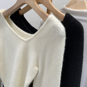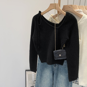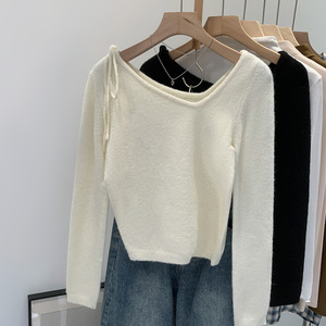 氛围感长袖针织衫女装韩版2025秋季新款内搭毛衣斜领系带收腰上衣