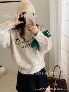 以时 25年秋冬季新款韩系简约重工字母刺绣软糯毛衣 圆领针织衫女