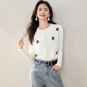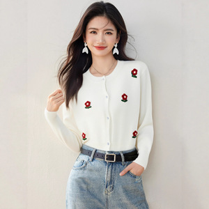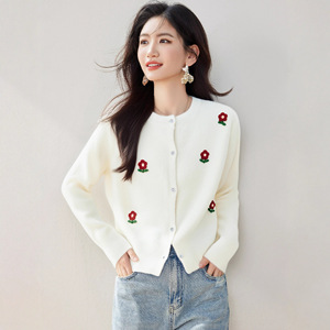温柔风粉色立体花朵毛衣外套女秋季甜美减龄宽松圆领单排扣针织衫