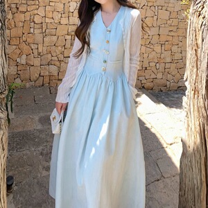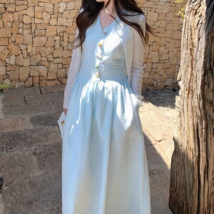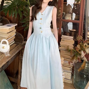 「氧气奶蓝」小香感马甲无袖背心连衣裙法式气质收腰长裙